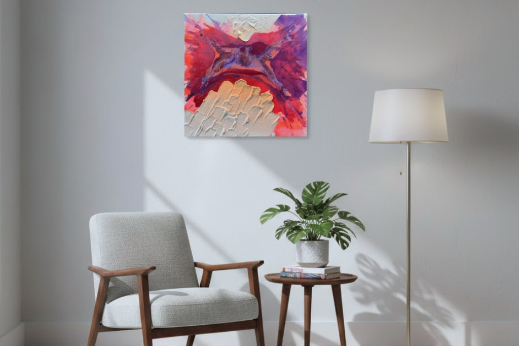 Outburst captures the instant where energy breaks free. Layers of red, violet, and orange collide with textured calm, revealing the raw beauty of release.